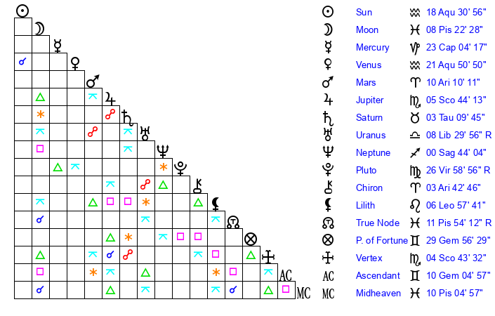 Moon | 8 Pisces 18 | 19 Gemini 48 | 10 Pisces 25 |