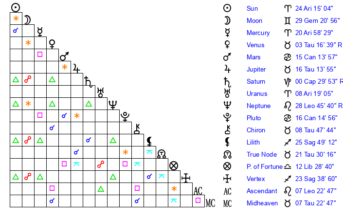 | Venus | 3 Taurus 17 | 24 Pisces 42 | 12 Gemini 1 |