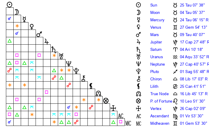 | Moon | 3 Taurus 56 | 28 Sagittarius 30 | 26 Taurus 3 |