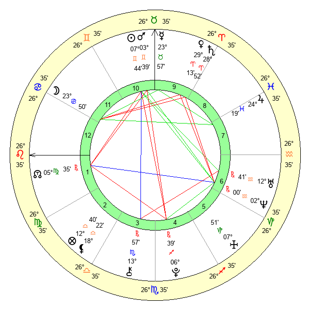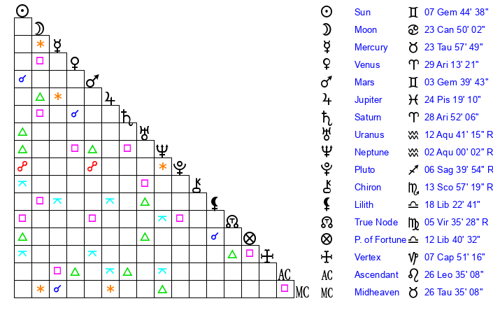 Mars | 3 Gemini 40 | 19 Leo 38 | 22 Gemini 28 |