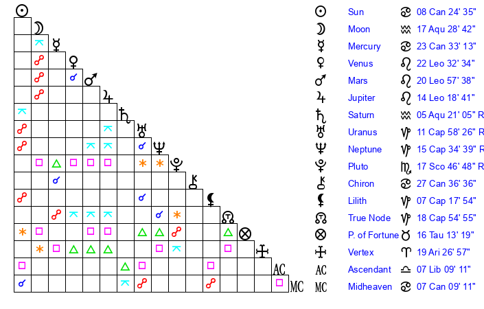 Jupiter | 14 Leo 14 | 4 Cancer 45 | 21 Leo 20 |