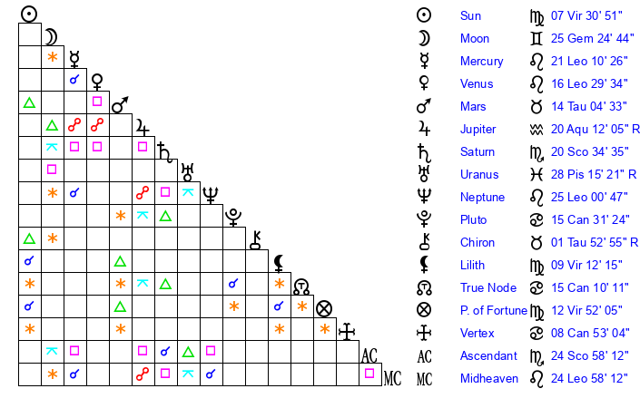| Moon | 25 Gemini 28 | 13 Sagittarius 23 | 29 Capricorn 8 |
