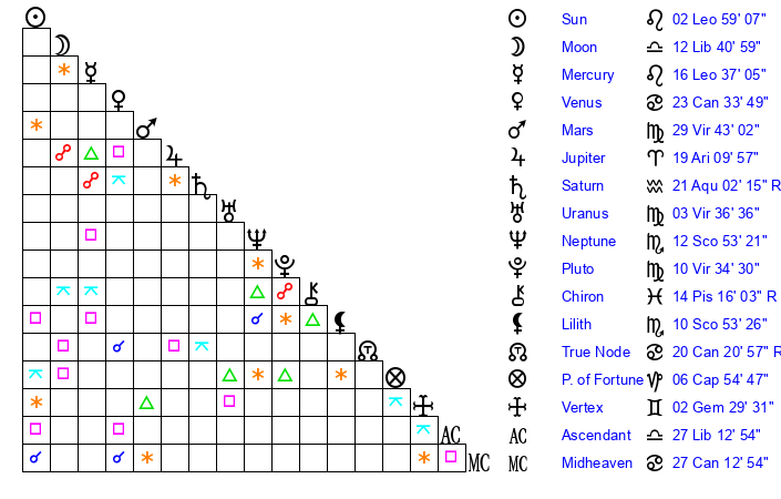 | Mars | 29 Virgo 43 | 23 Virgo 4 | 9 Scorpio 40 |