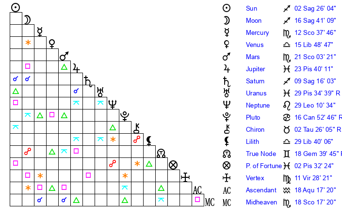 | Moon | 16 Sagittarius 48 | 3 Aquarius 30 | 26 Cancer 54 |