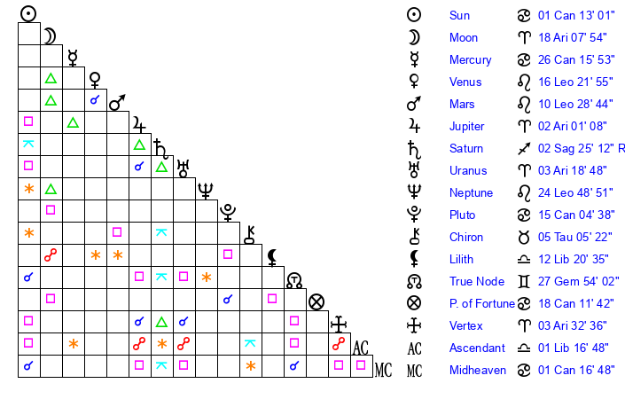 | Sun | 1 Cancer 13 | 2 Cancer 29 | 5 Libra 33 |