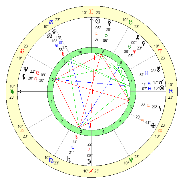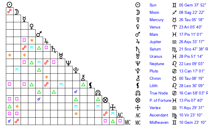 | Sun | 5 Gemini 38 | 6 Gemini 39 | 10 Virgo 25 |