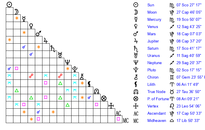 | Saturn | 17 Scorpio 59 | 25 Pisces 45 | 22 Scorpio 47 |