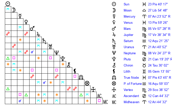 | Moon | 27 Libra 52 | 28 Virgo 52 | 20 Pisces 0 |