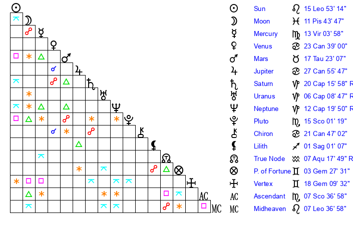 | Pluto | 15 Scorpio 1 | 2 Aquarius 14 | 15 Scorpio 37 |