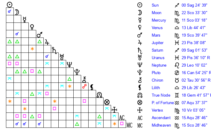 | Mars | 19 Scorpio 40 | 13 Sagittarius 55 | 1 Aquarius 6 |
