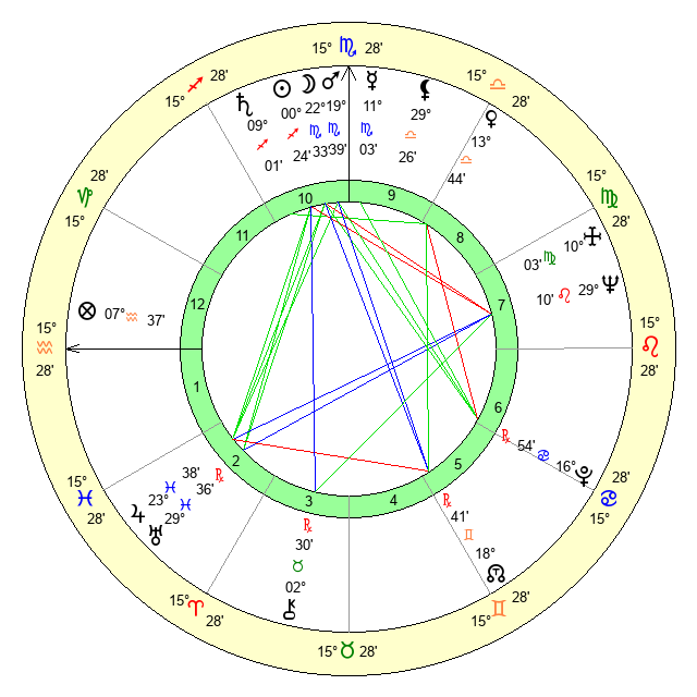 | Moon | 22 Scorpio 38 | 9 Capricorn 9 | 0 Cancer 1 |