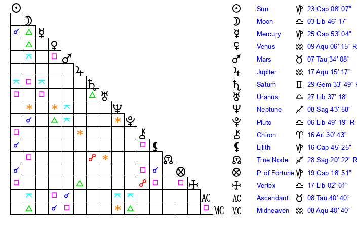 | Mercury | 25 Capricorn 53 | 7 Capricorn 40 | 28 Aquarius 6 |