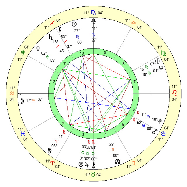 | Moon | 17 Aquarius 6 | 21 Scorpio 22 | 17 Virgo 26 |