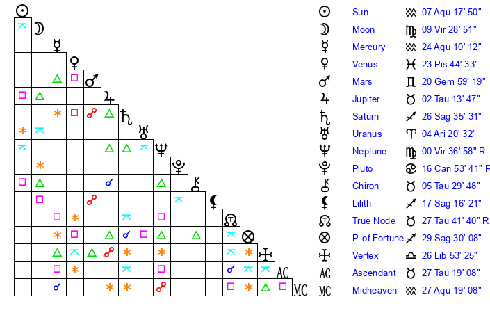 | Sun | 7 Aquarius 18 | 8 Aquarius 1 | 12 Taurus 45 |