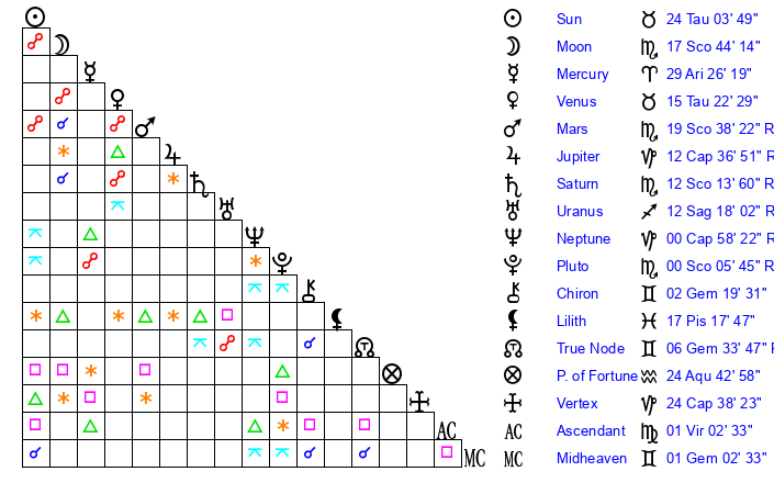 | Moon | 17 Scorpio 43 | 16 Sagittarius 18 | 9 Taurus 19 |