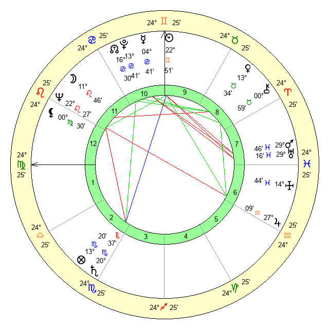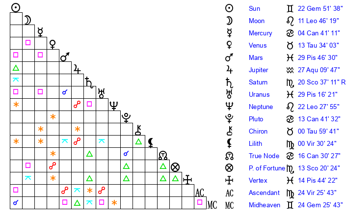 | Sun | 22 Gemini 51 | 23 Gemini 53 | 27 Virgo 57 |