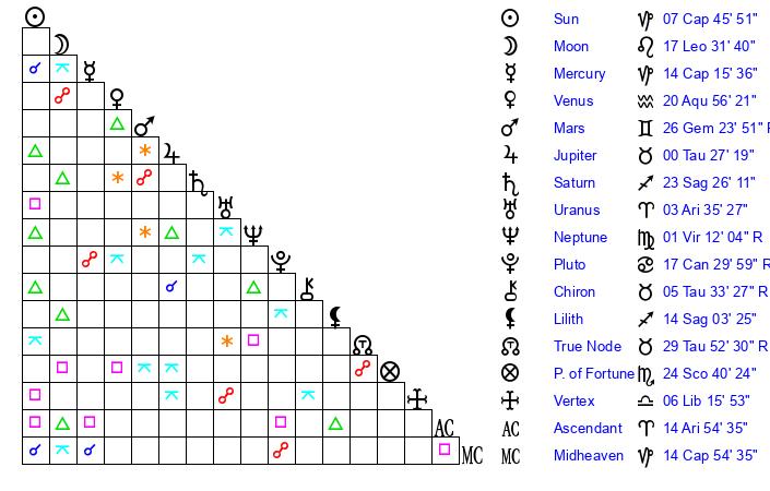 | Sun | 7 Capricorn 46 | 8 Capricorn 14 | 15 Aries 25 |