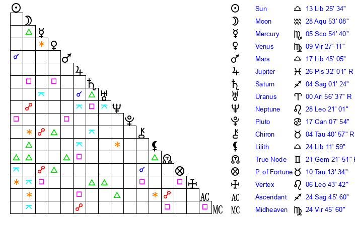 | Venus | 9 Virgo 27 | 22 Virgo 21 | 11 Sagittarius 32 |