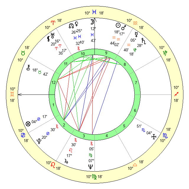 | Moon | 12 Pisces 38 | 3 Cancer 23 | 27 Cancer 58 |