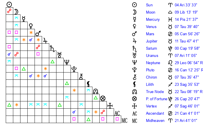 | Moon | 9 Libra 9 | 14 Aquarius 24 | 1 Aries 48 |