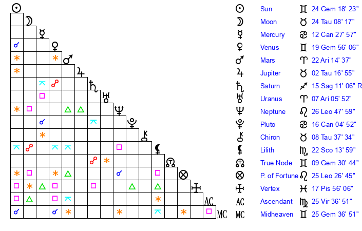 | Moon | 24 Taurus 10 | 16 Aquarius 11 | 12 Sagittarius 9 |