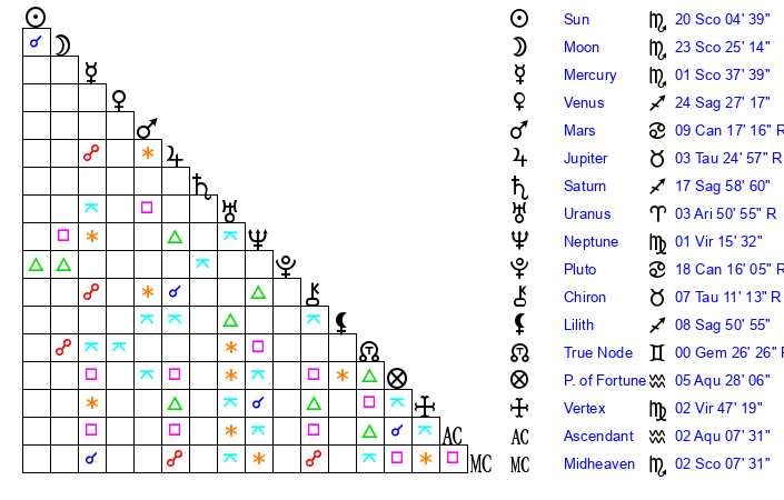 | Moon | 23 Scorpio 24 | 26 Leo 17 | 7 Gemini 46 |