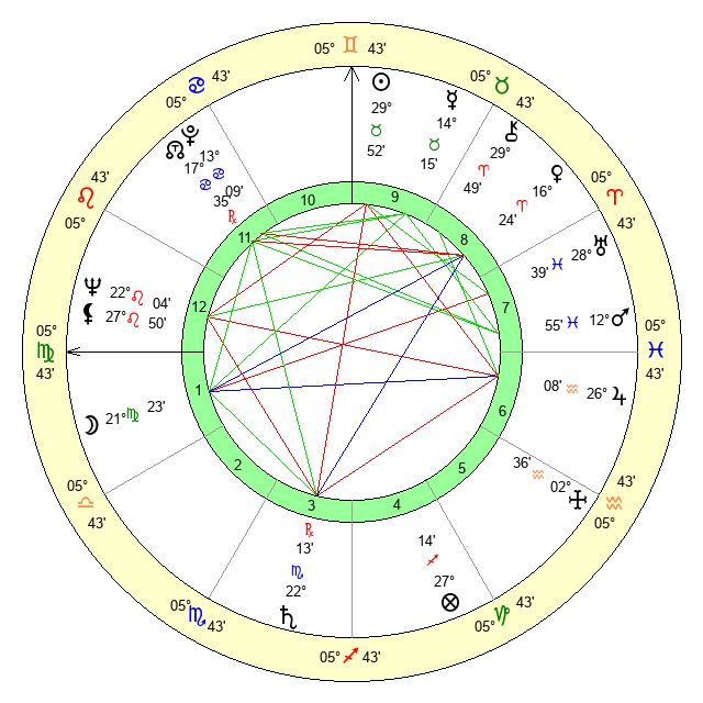 | Sun | 29 Taurus 52 | 0 Gemini 53 | 4 Virgo 37 |