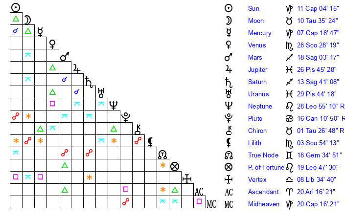 | Uranus | 29 Pisces 44 | 27 Taurus 54 | 4 Aries 18 |