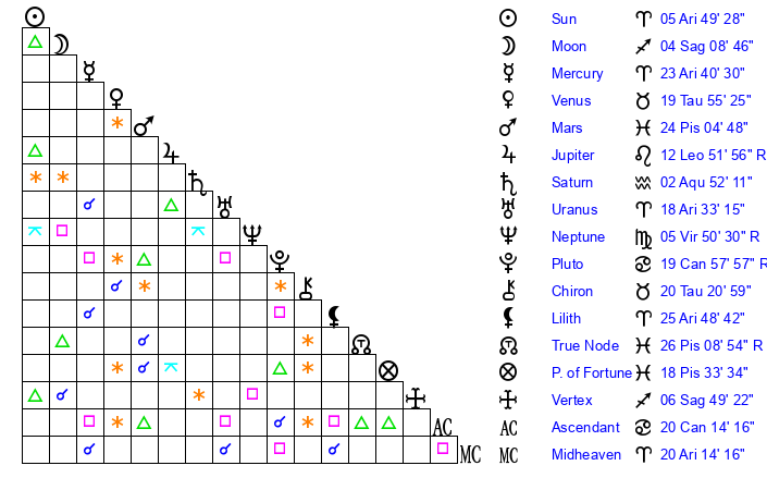 | Sun | 5 Aries 49 | 6 Aries 17 | 5 Cancer 47 |