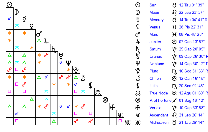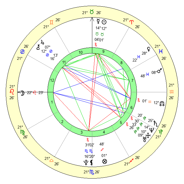 | Moon | 22 Leo 27 | 19 Cancer 42 | 26 Scorpio 31 |