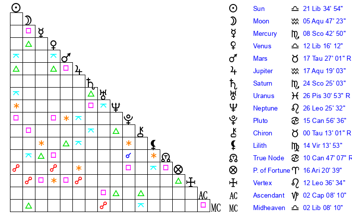 | Mercury | 8 Scorpio 43 | 13 Scorpio 2 | 27 Capricorn 47 |