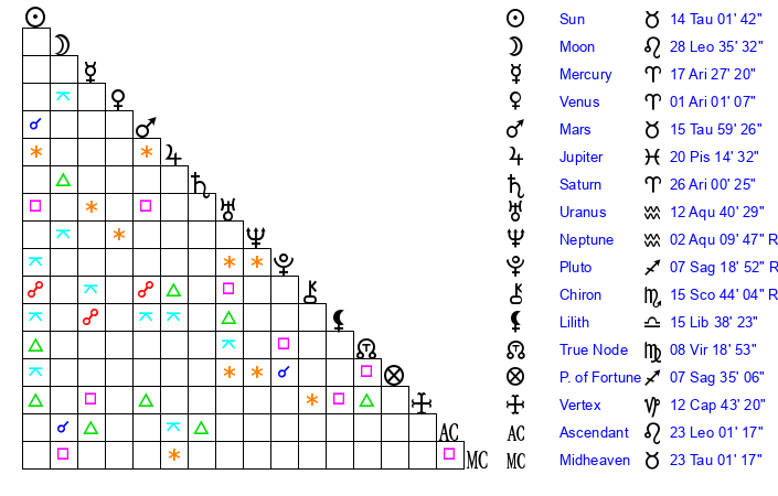 | Uranus | 12 Aquarius 40 | 26 Taurus 33 | 12 Aquarius 39 |