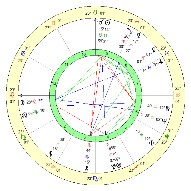 | Moon | 28 Leo 39 | 16 Leo 8 | 24 Leo 46 |