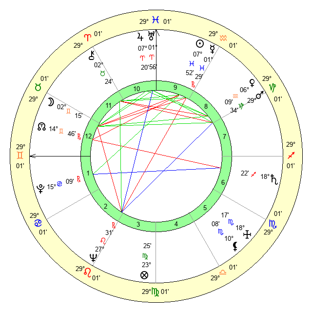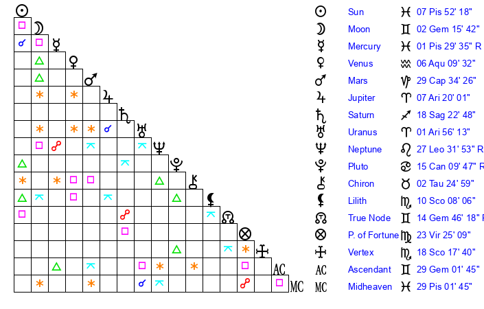 | Sun | 7 Pisces 52 | 9 Pisces 21 | 12 Gemini 50 |
