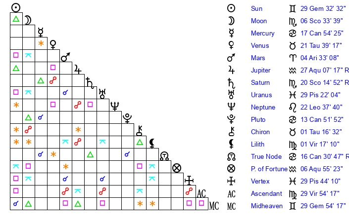 | Moon | 6 Scorpio 27 | 9 Taurus 9 | 4 Cancer 30 |