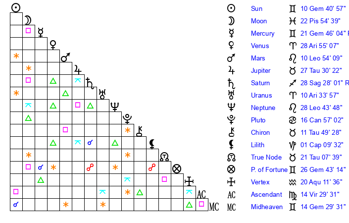 | Sun | 10 Gemini 41 | 11 Gemini 27 | 12 Virgo 37 |
