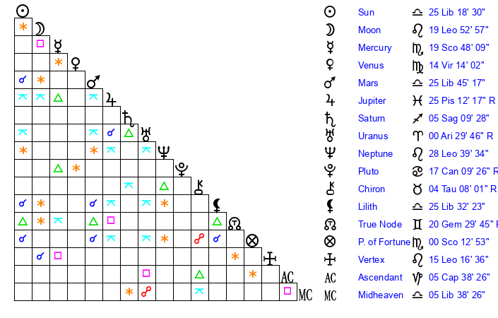 | Sun | 25 Libra 19 | 26 Libra 34 | 4 Aquarius 30 |