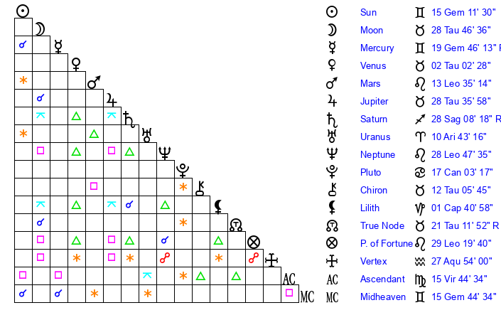 | Jupiter | 28 Taurus 32 | 29 Gemini 13 | 15 Gemini 17 |