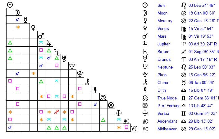 | Mercury | 22 Cancer 15 | 12 Leo 16 | 24 Scorpio 46 |
