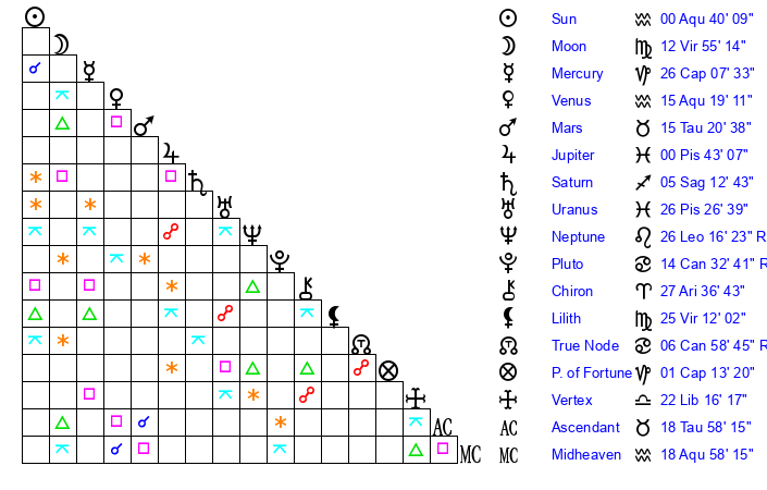 | Venus | 15 Aquarius 20 | 18 Pisces 34 | 15 Gemini 17 |