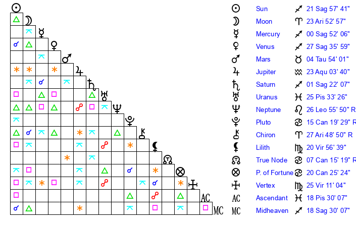 | Sun | 21 Sagittarius 58 | 22 Sagittarius 57 | 2 Aries 4 |