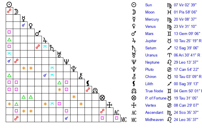 | Sun | 7 Virgo 3 | 7 Virgo 34 | 13 Sagittarius 20 |