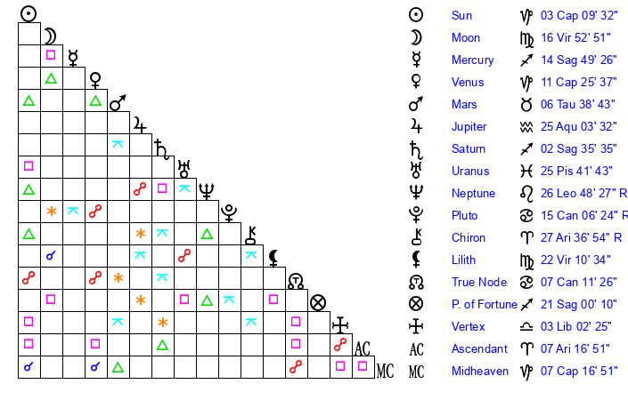 | Moon | 16 Virgo 51 | 8 Pisces 32 | 4 Taurus 37 |