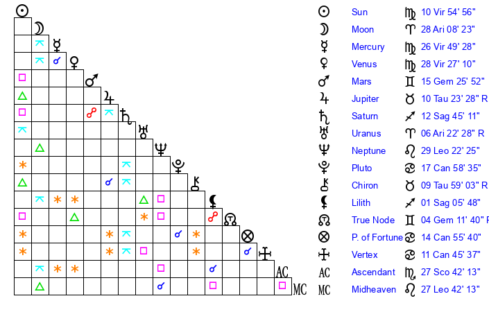 | Moon | 28 Aries 0 | 20 Capricorn 30 | 20 Scorpio 23 |