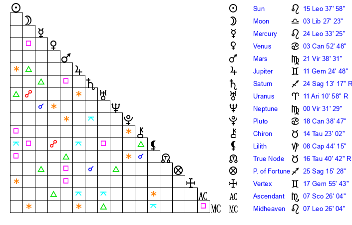 | Sun | 15 Leo 38 | 16 Leo 24 | 19 Scorpio 50 |