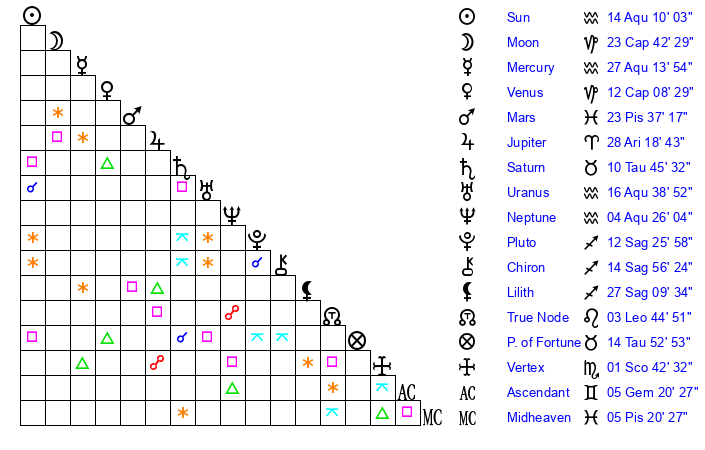 Sun | 14 Aquarius 10 | 15 Aquarius 7 | 9 Pisces 25 |
