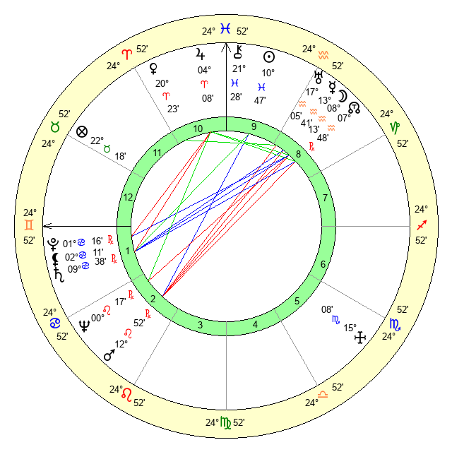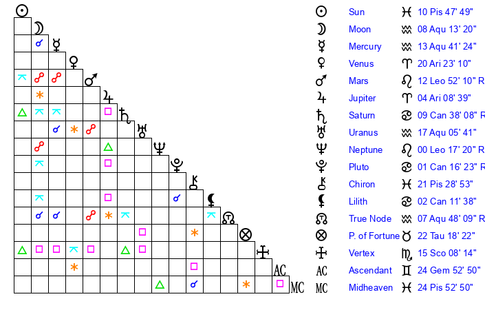 | Sun | 10 Pisces 48 | 11 Pisces 22 | 27 Gemini 4 |
