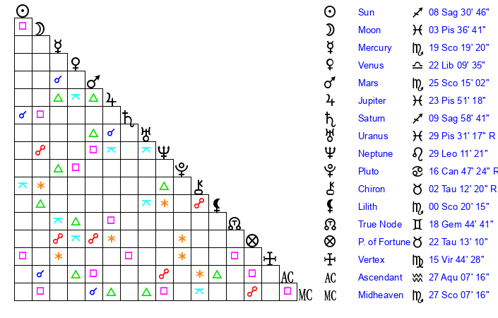 | Sun | 8 Sagittarius 31 | 9 Sagittarius 45 | 17 Pisces 54 |