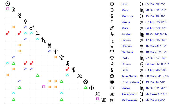 | Mercury | 15 Pisces 39 | 18 Pisces 51 | 4 Aries 23 |