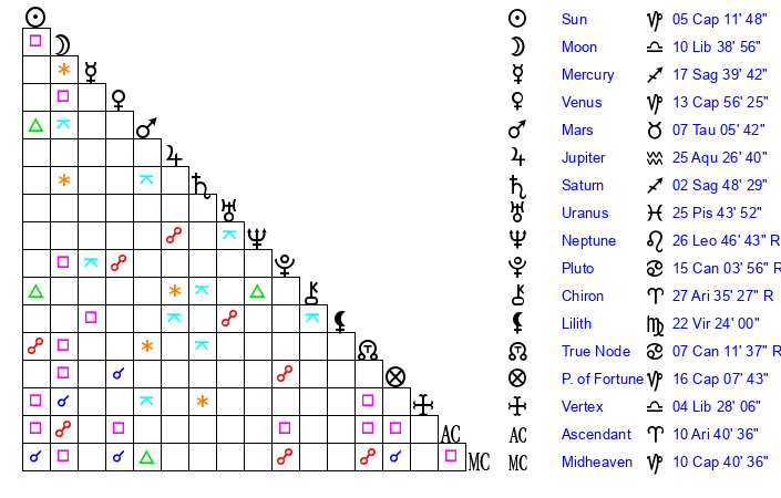 | Venus | 13 Capricorn 57 | 3 Capricorn 48 | 16 Taurus 41 |